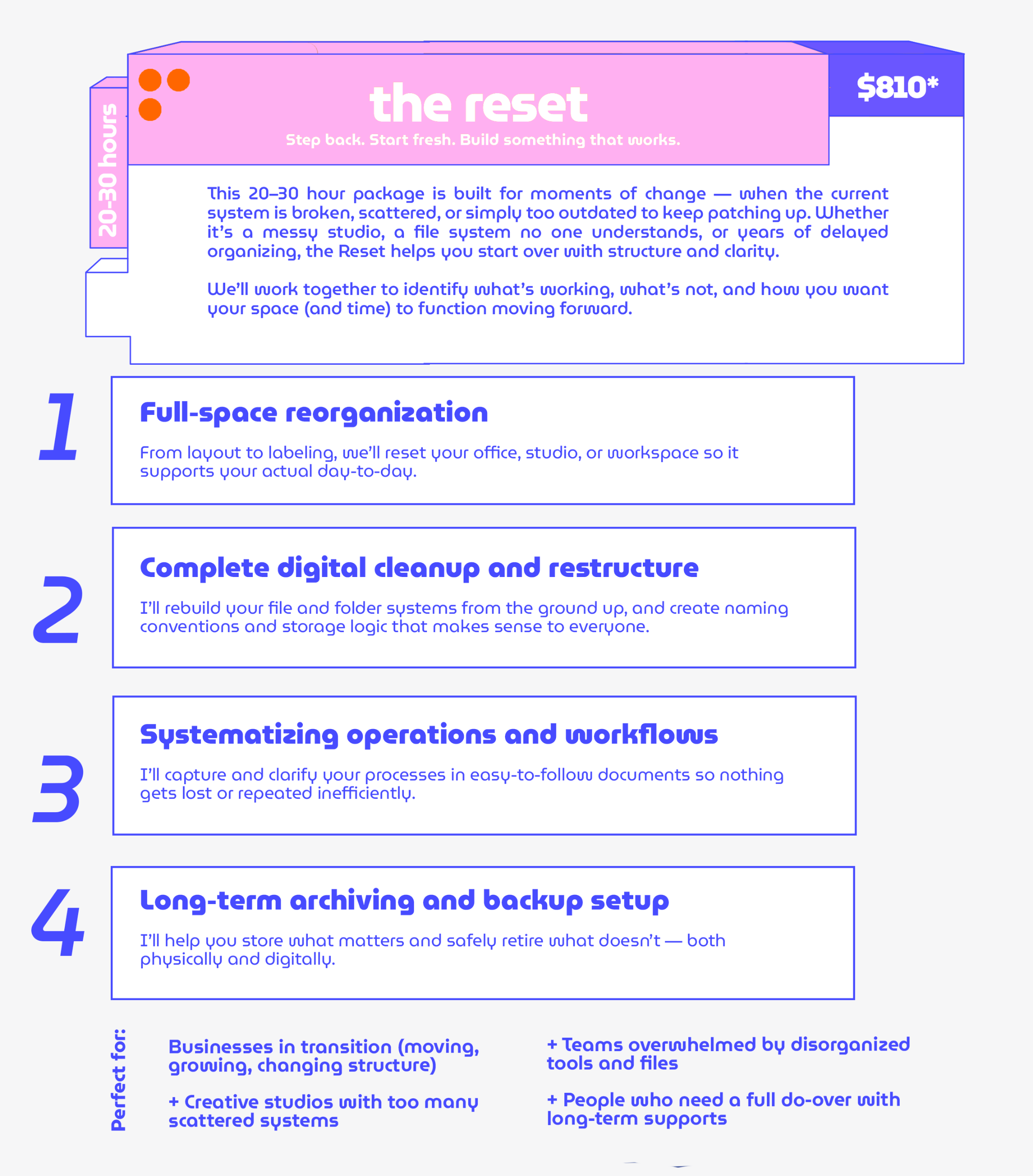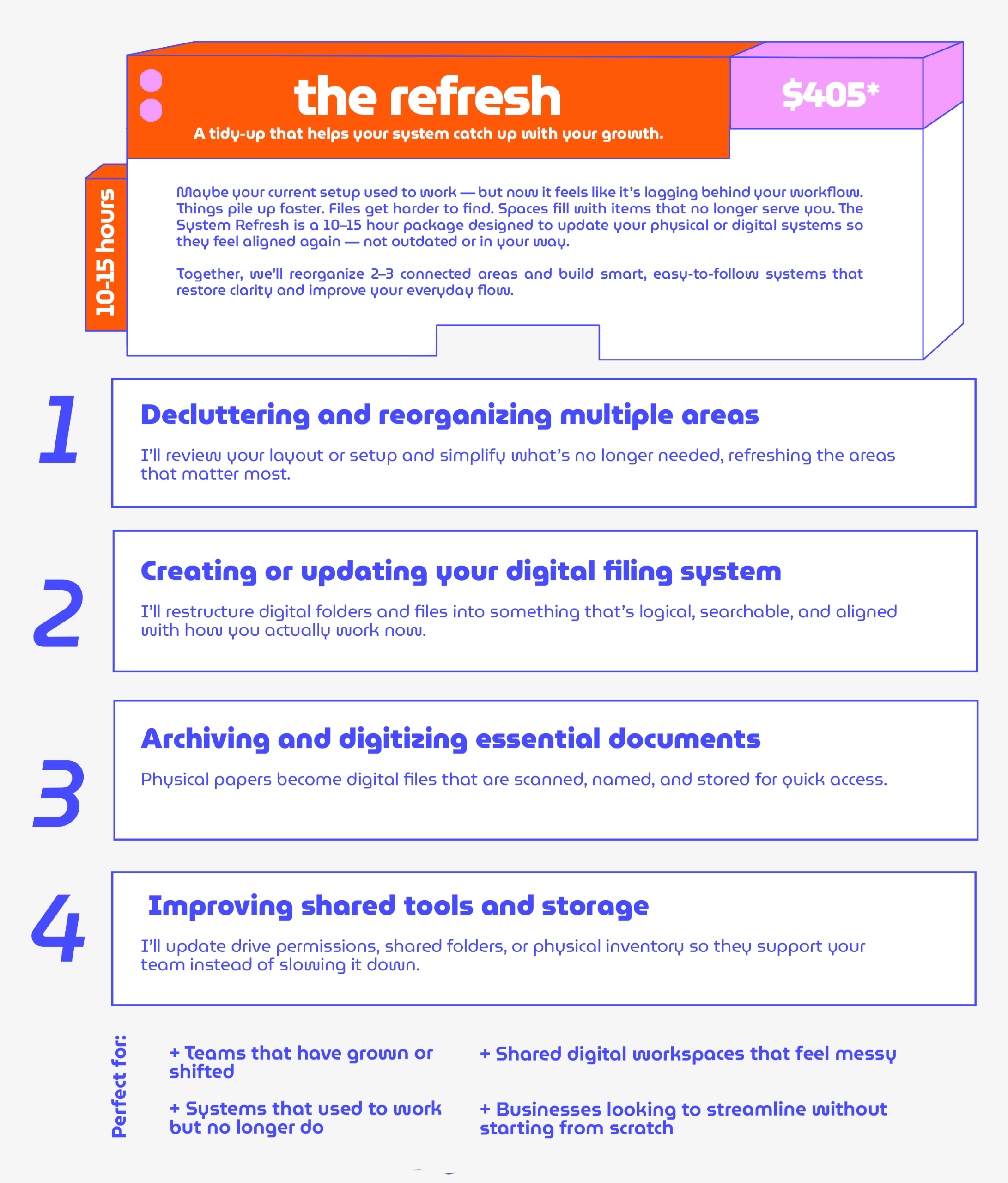When systems aren’t working, it’s not your fault—it just means they weren’t built with your needs in mind. I restructure filing systems and workflows so they’re simpler, more intuitive, and easier to keep up with day to day.