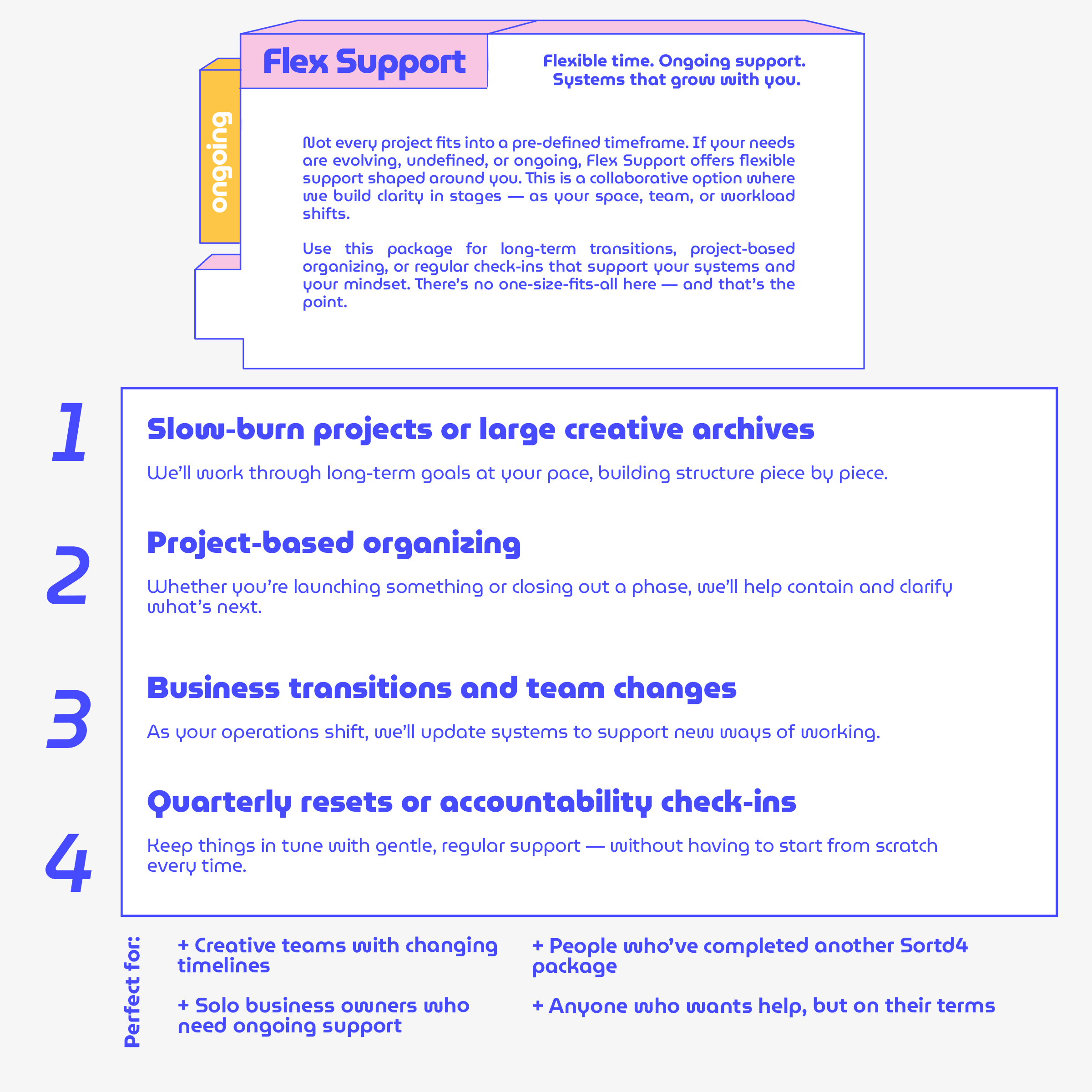 Sortd4 offers one-on-one organizing support to help businesses run more smoothly, save time, and breathe easier. Whether it’s restructuring workspaces, organizing physical and digital files, or streamlining internal systems, I create practical, easy-to-maintain solutions tailored to your business.With a flexible, creative approach, Sortd4 brings structure to chaos—so you can focus on what you do best.Every session booked this year helps build and sustain Kiin, a creative support space made by and for independent artists and makers.
