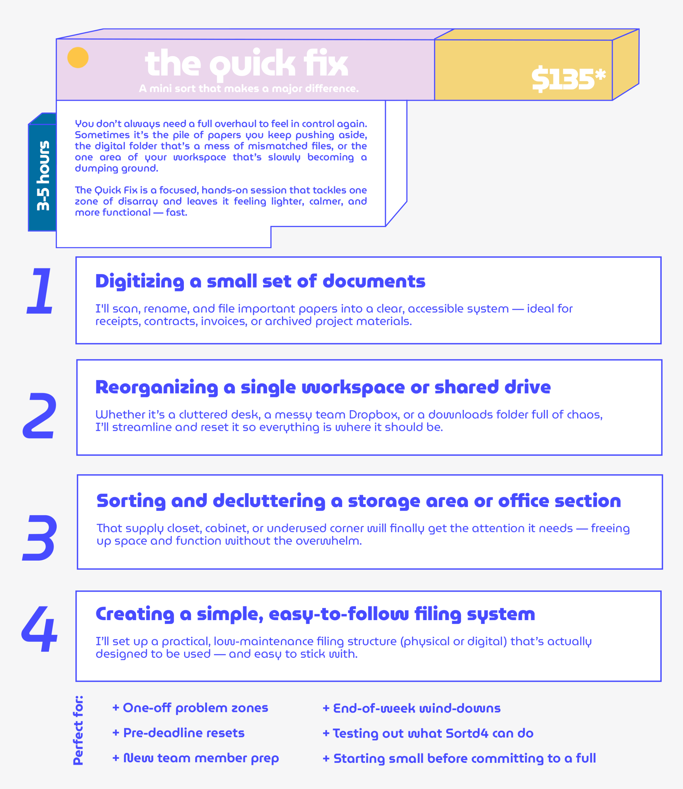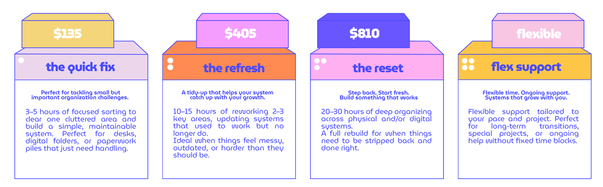 Each package is time-based (3–5 hrs, 10–15 hrs, or 20–30 hrs) and includes a consultation, hands-on organizing, and a summary of suggested systems. Services may cover workspace setup, storage optimization, document categorization, digital archiving, or a mix—depending on your needs.